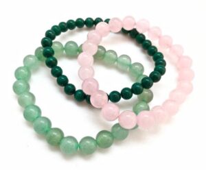 Cristaux : Quartz rose (amour de soi), Aventurine verte (compassion), Malachite, Rhodonite.